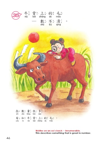 牛背上的毛 35 牛背上的毛 ─ 數不 清。 數不清 指數量很多, 指數量很多 有如牛背上的毛。 有如牛背上的毛 Bristles on an ox’s back ─ innumerable. This describes something that is great in number. 46
