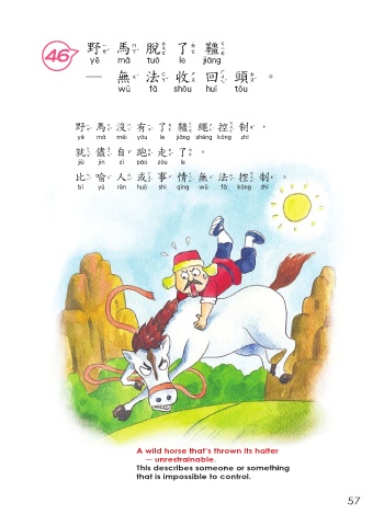 野馬脫了韁 46 野馬脫了韁 ─無法收回頭。 無法收回頭 野馬沒有了韁繩控制, 野馬沒有了韁繩控制 就儘自跑走了。 就儘自跑走了 比喻人或事情無法控制。 比喻人或事情無法控制 A wild horse that’s thrown its halter ─ unrestrainable. This describes someone or something that is impossible to control. 57