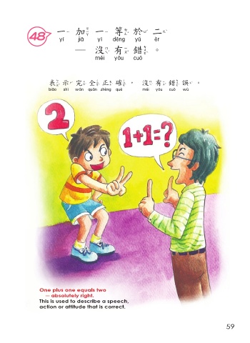 一 加 一 等於二 48 一加一等於二 ─沒有錯。 沒有錯 表示完全正確,沒有錯誤。 表示完全正確 沒有錯誤 One plus one equals two ─ absolutely right. This is used to describe a speech, action or attitude that is correct. 59