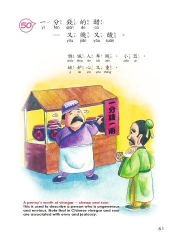 一 分錢的醋 50 一分錢的醋 ─又賤又酸。 又賤又酸 嘲諷人卑賤、小器、 嘲諷人卑賤 小器 嫉妒心又重。 嫉妒心又重 A penny’s worth of vinegar ─ cheap and sour. This is used to describe a person who is ungenerous and envious. Note that in Chinese vinegar and sour are associated with envy and jealousy. 61