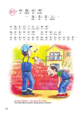 砌牆的磚 51 砌牆的磚 ─後來居上。 後來居上 砌牆是從下往上堆磚, 砌牆是從下往上堆磚 越是後砌的磚,放 得 越上面。 越是後砌的磚 放得越上面 指後來的或後輩勝過先來的或前輩。 指後來的或後輩勝過先來的或前輩 A wall of bricks ─ the last are on top. This describes juniors rising above seniors. 62