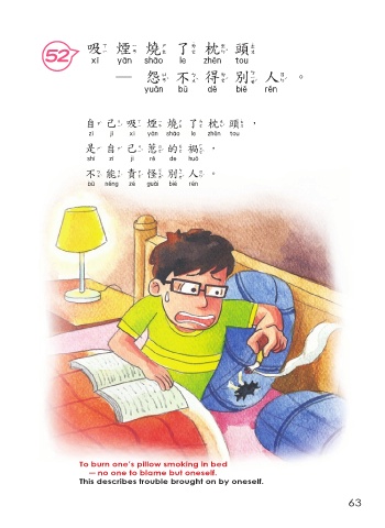 吸煙燒了枕 頭 52 吸煙燒了枕頭 ─怨 不 得別人。 怨不得別人 砌牆是從下往上堆磚, 自己吸煙燒了枕 頭 , 自己吸煙燒了枕頭 越是後砌的磚,放 得 越上面。 是自己惹的禍, 是自己惹的禍 指後來的或後輩勝過先來的或前輩。 不 能責怪別人。 不能責怪別人 To burn one’s pillow smoking in bed ─ no one to blame but oneself. This describes trouble brought on by oneself. 63