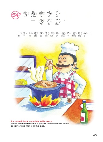 煮熟的鴨 子 54 煮熟的鴨子 ─飛 不了 。 飛不了 比喻人跑 不了 或事情已成定局。 比喻人跑不了或事情已成定局 A cooked duck ─ unable to fly away. This is used to describe a person who can’t run away or something that is in the bag. 65