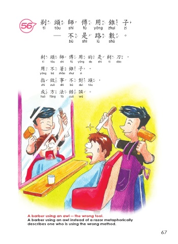 剃頭師傅用錐 子 56 剃頭師傅用錐子 ─不是路數。 不是路數 剃頭師傅用的是剃刀, 剃頭師傅用的是剃刀 用 不 著 錐 子 。 用不著錐子 指做事不對頭, 指做事不對頭 或方法錯誤。 或方法錯誤 A barber using an awl ─ the wrong tool. A barber using an awl instead of a razor metaphorically describes one who is using the wrong method. 67