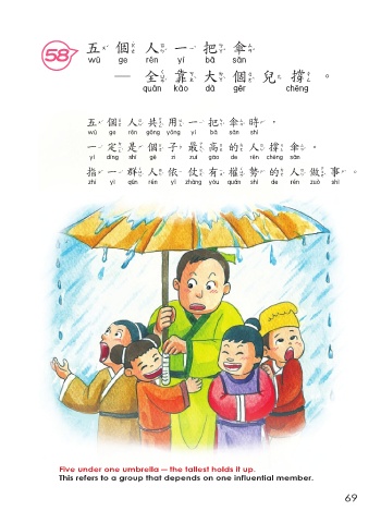 五個人 一 把傘 58 五個人一把傘 ─全靠大 個 兒 撐。 全靠大 撐 五個人共用 一 把傘時, 五個人共用一把傘時 一定是 個子 最高的人撐傘。 一定是個子最高的人撐傘 指 一 群人依仗有權勢的人做事。 指一群人依仗有權勢的人做事 Five under one umbrella ─ the tallest holds it up. This refers to a group that depends on one influential member. 69
