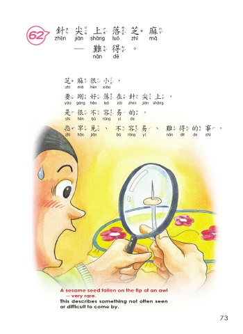 針尖上落芝麻 62 針尖上落芝麻 ─難得。 難得 芝麻很小, 芝麻很小 要剛好落在針尖上, 要剛好落在針尖上 是很 不 容易的。 是很不容易的 指罕見、 不 容易、 難得的事。 指罕見 不容易 難得的事 A sesame seed fallen on the tip of an awl ─ very rare. This describes something not often seen or difficult to come by. 73