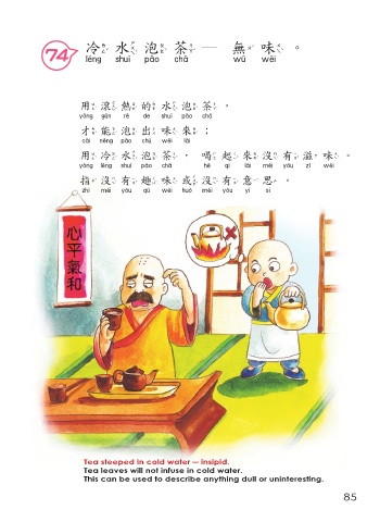 冷水泡茶─無味。 74 冷水泡茶 無味 用滾熱的水泡茶, 用滾熱的水泡茶 才能泡出味來; 才能泡出味來 用冷水泡茶,喝起來沒有滋味。 用冷水泡茶 喝起來沒有滋味 指沒有趣味或沒有意 思 。 指沒有趣味或沒有意思 Tea steeped in cold water ─ insipid. Tea leaves will not infuse in cold water. This can be used to describe anything dull or uninteresting. 85