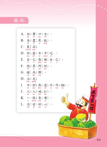 選項 A. 白費口舌。 白費口舌 B. 各盡其能。 各盡其能 C. 裝蒜 裝蒜 D. 好看不中吃。 好看不 中 吃 E. 自己恭維自己。 自己恭維自己 F. 投其所好。 投其所 好 G. 瞎高興。 瞎高興 H. 沾光 沾光 I. 不到熟透不外掏。 不到熟透不外掏 J. 人人喊打。 人人喊打 K 一張臭嘴。 一 張臭嘴 L. 沒安好心。 沒安好心 93