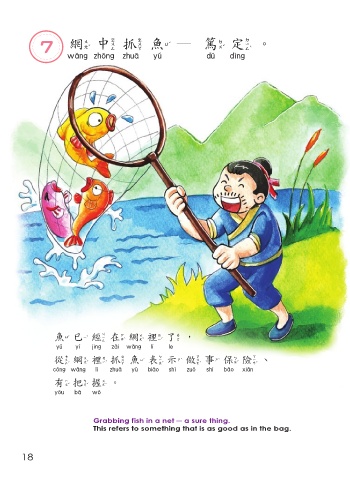 7 網中抓魚─篤定。 網中抓魚 篤定 魚已經在網裡了, 魚已經在網裡了 從網裡抓魚表示做事保險、 從網裡抓魚表示做事保險 有把握。 有把握 Grabbing fish in a net ─ a sure thing. This refers to something that is as good as in the bag. 18
