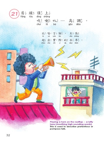 21 房頭頂上 房頭頂上 吹喇 ─高 調 。 吹喇吧 高調 比喻言論、主張 比喻言論 主張 超出實際的水準。 超出實際的水準 Playing a horn on the rooftop ─ a lofty tone (mouthing high sounding words). This is used to describe pretentious or pompous talk. 32