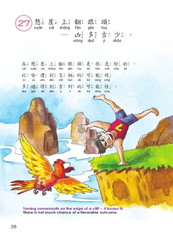 27 懸崖上翻跟 頭 懸崖上翻跟頭 ─凶多吉少。 凶多吉少 在懸崖上翻跟 頭 是很危險的。 在懸崖上翻跟頭是很危險的 比喻遭到災禍的可能性 比喻遭到災禍的可能性 多過得到吉利的可能性。 多過得到吉利的可能性 Turning somersaults on the edge of a cliff ─ it bodes ill. There is not much chance of a favorable outcome. 38