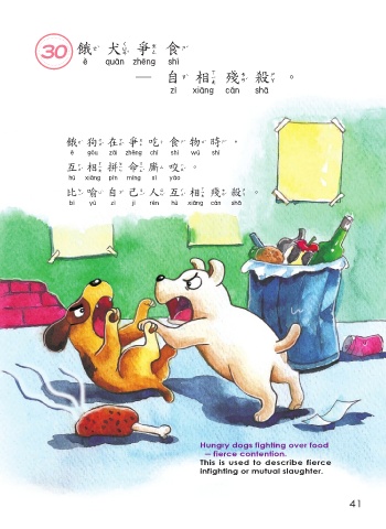 30 餓犬爭食 餓犬爭食 ─自相殘殺。 自相殘殺 餓狗在爭吃食物時, 餓狗在爭吃食物時 互相拼命廝咬。 互相拼命廝咬 比喻自己人互相殘殺。 比喻自己人互相殘殺 Hungry dogs fighting over food ─ fierce contention. This is used to describe fierce infighting or mutual slaughter. 41