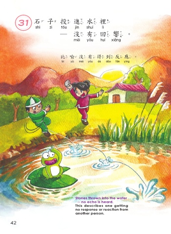 31 石 子 投進水裡 石子投進水裡 ─沒有回響。 沒有回響 比喻沒有得到反 應 。 比喻沒有得到反應 Stones thrown into the water ─ no echo is heard. This describes one getting no response or reaction from another person. 42