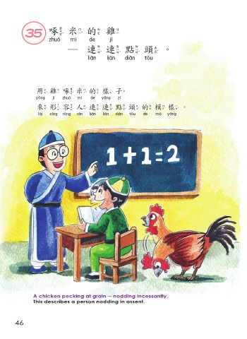 35 啄米的雞 啄米的雞 ─連連點頭。 連連點頭 用雞啄米的樣 子 用雞啄米的樣子 來形容人連連點頭的模樣。 來形容人連連點頭的模樣 A chicken pecking at grain ─ nodding incessantly. This describes a person nodding in assent. 46