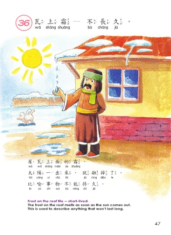 36 瓦上霜─ 不 長久。 瓦上霜 不長久 屋瓦上面的霜, 屋瓦上面的霜 太陽 一 出來,就融掉了。 太陽一出來 就融掉了 比喻事物 不 能持久。 比喻事物不能持久 Frost on the roof tile ─ short-lived. The frost on the roof melts as soon as the sun comes out. This is used to describe anything that won’t last long. 47
