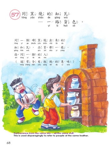 57 同窯燒的缸瓦 同窯燒的缸瓦 ─一路貨色。 一路貨色 同 一 個磚窯燒出來的 同一個磚窯燒出來的 缸 和 瓦,品質都一樣。 缸汗瓦 品質都一樣 指同一類的人 指同一類的人 (通常含有輕視的意味)。 通常含有輕視的意味 Earthenware from the same kiln ─ all the same stuff. This is used disparagingly to refer to people of the same feather. 68