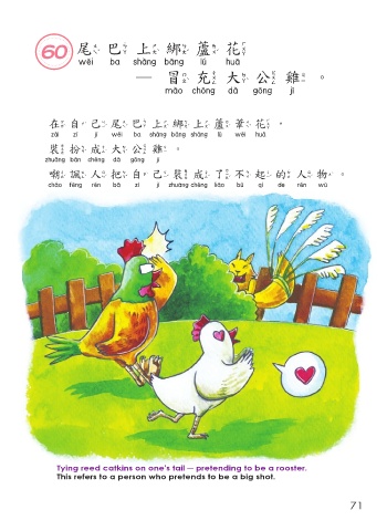 60 尾 巴 上綁蘆花 尾巴上綁蘆花 ─冒充大公雞。 冒充大公雞 在自己尾 巴 上綁上蘆葦花, 在自己尾巴上綁上蘆葦花 裝扮成大公雞。 裝扮成大公雞 嘲諷人把自己裝成 了不 起的人物。 嘲諷人把自己裝成了不起的人物 Tying reed catkins on one's tail ─ pretending to be a rooster. This refers to a person who pretends to be a big shot. 71