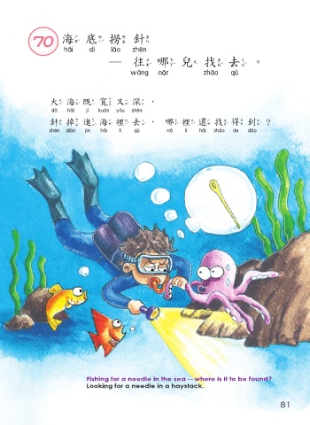 70 海底撈針 海底撈針 ─往哪 兒 找去。 往 找去 大海既寬又深, 大海既寬又深 針掉進海裡去,哪裡還找 得 到? 針掉進海裡去 哪裡還找得到 Fishing for a needle in the sea ─ where is it to be found? Looking for a needle in a haystack. 81