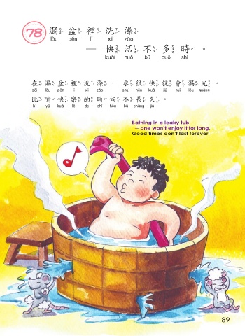 78 漏盆裡洗澡 漏盆裡洗澡 ─快活 不 多時。 快活不多時 在漏盆裡洗澡,水很快就會漏光。 在漏盆裡洗澡 水很快就會漏光 比喻快樂的時候 不 長久。 比喻快樂的時候不長久 Bathing in a leaky tub ─ one won’t enjoy it for long. Good times don’t last forever. 89