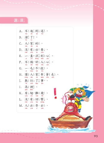 選項 A. 不進則退。 不進則退 B. 溜了。 溜了 C. 人家的。 人家的 D. 沒有必要。 沒有必要 E. 一直涼到心。 一 直涼到心 F. 不識好人心。 不識好人心 G. 一毛不拔。 一 毛 不 拔 H. 讓人家牽著走。 讓人家牽著走 I. 敷衍了事。 敷衍 了 事 J. 高調。 高 調 K. 有翅難飛。 有翅難飛 L. 沒有回響。 沒有回響 M. 人云亦云。 人云亦云 93