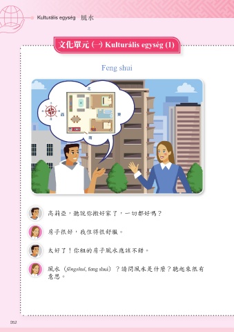 Kulturális egység 風水 文化單元(一) Kulturális egység (1) Feng shui 高莉亞,聽說你搬好家了,一切都好嗎? 房子很好,我住得很舒服。 太好了!你租的房子風水應該不錯。 風水(fēngshuǐ, feng shui)?請問風水是什麼?聽起來很有 意思。 052