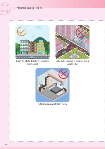 Kulturális egység 風水 Négyzet alakú lakóhely, mögötte Lakóhely egészen a bejárati ajtóig dombokkal Tetőszerkezet gerenda vezető úttal A tetőgerenda alatt fekvő ágy 054
