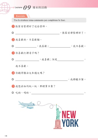 09 Lezione 週末的活動 Esercizio Usa la struttura tema-commento per completare le frasi. 1 張家安整理好了這些資料。 ,張家安都整理好了。 2 我喜歡狗,不喜歡貓。 ,我喜歡; ,我不喜歡。 3 你喜歡打掃房子嗎? ,我喜歡;但是 , 我不喜歡。 4 你聽得懂法文和德文嗎? ,我都聽不懂。 5 我想去紐約玩一玩,那裡貴不貴? 吃的、喝的, 。 Viaggio 148
