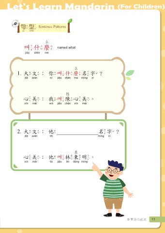 Let's Learn Mandarin (For Children) 句型 Sentence Patterns 句型 么 叫什麼 named what 叫什麼 么 1. 大文:你叫什麼名字? 大文 你叫什麼名字 陳 心美:我叫陳心美。 心美 我叫陳心美 2. 大文:他 名字? 大文 他 名字 東 心美:他叫林東明。 心美 他叫林東明 學華語向前走 13
