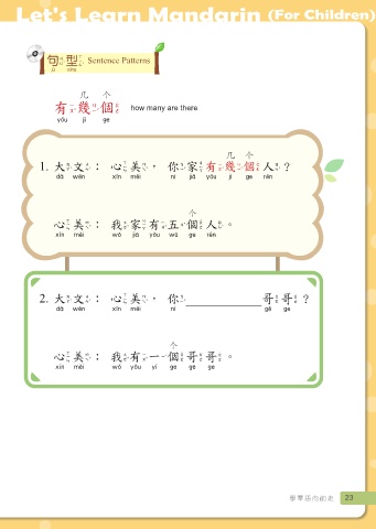 Let's Learn Mandarin (For Children) 句型 Sentence Patterns 句型 幾 個 有幾個 how many are there 有幾個 幾 個 1. 大文:心美,你家有幾個人? 大文 心美 你家有幾個人 個 心美:我家有五個人。 心美 我家有五個人 2. 大文:心美,你 哥哥? 大文 心美 你 哥哥 個 心美:我有一個哥哥。 心美 我有一個哥哥 學華語向前走 23