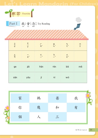 Let's Learn Mandarin (For Children) 練習 Exercise 練習 Part I 我會念 Try Reading 我會念 個 家 和 人 爸 媽 三 有 幾 你 我 個 家 和 人 爸 媽 三 有 幾 你 我 家 媽 爸 我 你 幾 和 有 個 人 三 學華語向前走 25