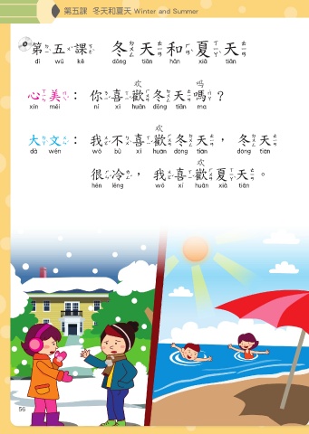 第五課 冬天和夏天 Winter and Summer 第五課 冬天和夏天 第五課 冬 天 和 夏天 歡 嗎 心美:你喜歡冬天嗎? 心美 你喜歡冬天嗎 歡 大文: 我不喜歡冬天,冬天 大文 我不喜歡冬天 冬天 歡 很冷,我喜歡夏天。 很冷 我喜歡夏天 56