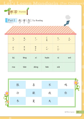 Let's Learn Mandarin (For Children) 練習 Exercise 練習 Part I 我會念 Try Reading 我會念 不 冷 喜 歡 你 我 嗎 天 冬 很 夏 不 冷 喜 歡 你 我 嗎 天 冬 很 夏 很 喜 不 嗎 冷 歡 我 你 冬 夏 天 學華語向前走 61