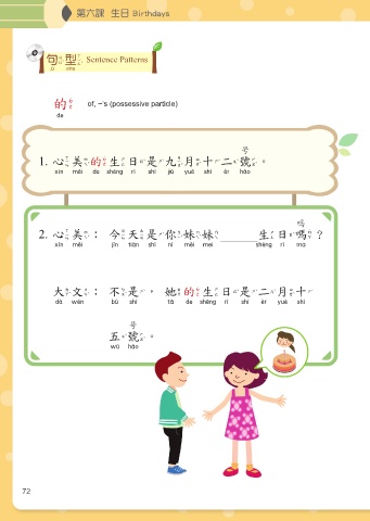 第六課 生日 Birthdays 句型 Sentence Patterns 句型 的 of, ~’s (possessive particle) 的 號 1. 心美的生日是九月十二號。 心美的生日是九月十二號 嗎 2. 心美:今天是你妹妹 生日嗎? 心美 今天是你妹妹 生日嗎 大文:不是,她的生日是二月十 大文 不是 她的生日是二月十 號 五號。 五號 72