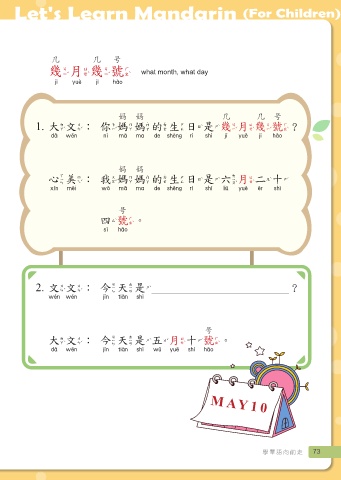 Let's Learn Mandarin (For Children) 幾 幾 號 幾月幾號 what month, what day 幾月幾號 媽 媽 幾 幾 號 1. 大文:你媽媽的生日是幾月幾號? 大文 你媽媽的生日是幾月幾號 媽 媽 心美:我媽媽的生日是六月二十 心美 我媽媽的生日是六月二十 號 四號。 四號 2. 文文:今天是 ? 文文 今天是 號 大文:今天是五月十號。 大文 今天是五月十號 MAY10 學華語向前走 73