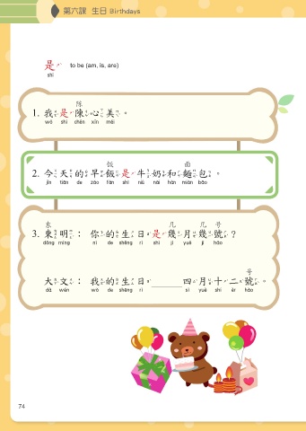 第六課 生日 Birthdays 是 to be (am, is, are) 是 陳 1. 我是陳心美。 我是陳心美 飯 麵 2. 今天的早飯是牛奶和麵包。 今天的早飯是牛奶和麵包 東 幾 幾 號 3. 東明:你的生日是幾月幾號? 東明 你的生日是幾月幾號 號 大文:我的生日 四月十二號。 大文 我的生日 四月十二號 74