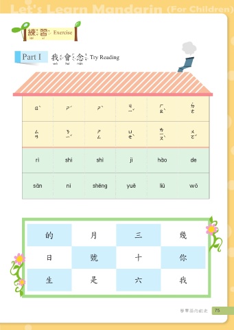 Let's Learn Mandarin (For Children) 練習 Exercise 練習 Part I 我會念 Try Reading 我會念 日 十 是 幾 號 的 三 你 生 月 六 我 日 十 是 幾 號 的 三 你 生 月 六 我 的 月 三 幾 日 號 十 你 生 是 六 我 學華語向前走 75