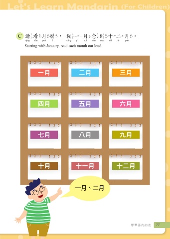 Let's Learn Mandarin (For Children) C 請看月曆,從一月念到十二月。 請看月曆 從 一 月念到十二月 Starting with January, read each month out loud. 一月 二月 三月 四月 五月 六月 七月 八月 九月 十月 十一月 十二月 一月、二月 學華語向前走 77
