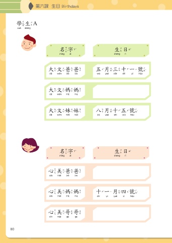 第六課 生日 Birthdays 學生A 學生 名字 生日 名字 生日 大文爸爸 五月三十一號 大文爸 爸 五月三十 一 號 大文媽媽 大文媽 媽 大文妹妹 八月十五號 大文妹 妹 八月十五號 名字 生日 名字 生日 心美爸爸 心美爸 爸 心美媽媽 十一月四號 心美媽 媽 十 一 月四號 心美哥哥 心美哥 哥 80