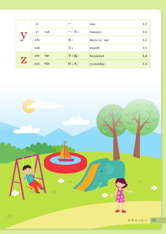 一 一 one L2 y 一月 一月 January L6 有 有 there is / are L2 月 月 month L6 z 早飯 早飯 breakfast L4 昨天 yesterday L6 昨天 學華語向前走 93