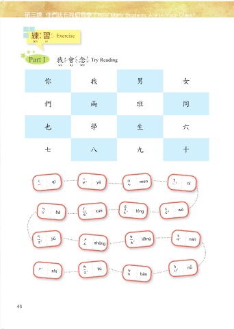 第三課 你們班有幾個同學?How Many Students Are in Your Class? 練習 Exercise 練習 Part I 我會念 Try Reading 我會念 你 我 男 女 們 兩 班 同 也 學 生 六 七 八 九 十 七 qī 也 yě 們 men 你 nǐ 八 bā 學 xué 同 tóng 我 wǒ 九 jiǔ 生 shēng 兩 liǎng 男 nán 十 shí 六 liù 班 bān 女 nǚ 46