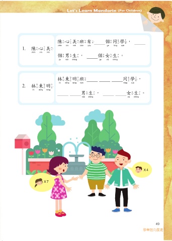 Let's Learn Mandarin (For Children) 陳心美班有 個同學, 1. 陳心美 陳心美班有 個同學 陳心美 個男生, 個女生。 個男生 個女生 林東明班 同學, 2. 林東明 林東明班 同學 林東明 男生, 女生。 男 生 女 生 X 4 X 7 49 學華語向前走