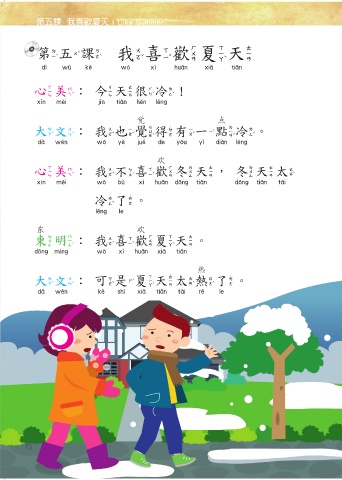 第五課 我喜歡夏天 I Like Summer 第五課 我喜歡夏天 第 五 課 我喜歡夏天 心美:今天很冷! 心美 今天很冷 覺 點 大文:我也覺得有一點冷。 大文 我也覺得有一點冷 歡 心美: 我不喜歡冬天,冬天太 心美 我不喜歡冬天 冬天太 冷了。 冷了 東 歡 東明:我喜歡夏天。 東明 我喜歡夏天 熱 大文:可是夏天太熱了。 大文 可是夏天太熱了 72