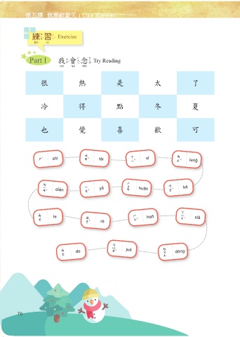 第五課 我喜歡夏天 I Like Summer 練習 Exercise 練習 Part I 我會念 Try Reading 我會念 很 熱 是 太 了 冷 得 點 冬 夏 也 覺 喜 歡 可 是 shì 太 tài 喜 xǐ 冷 lenǧ 點 diǎn 也 yě 歡 huān 可 kě 了 le 熱 rè 很 hen ˇ 夏 xià 的 de 覺 jué 冬 dōng 78