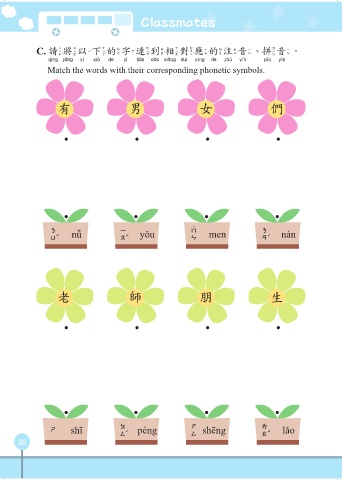 Classmates C. 請將以下的字連到相對應的注音、拼音。 請將以下的字連到相對應的注音 拼音 Match the words with their corresponding phonetic symbols. 有 男 女 們 女 nǚ 有 yǒu 們 men 男 nán 老 師 朋 生 師 shī 朋 péng 生 shēng 老 lǎo 30
