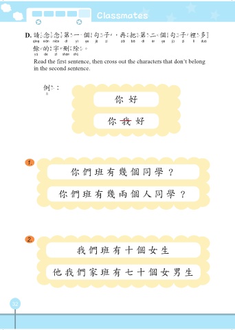 Classmates D. 請念念第一個句子,再把第二個句子裡多 請念念第一個句子 再把第二個句子裡多 餘的字刪除。 餘的字刪除 Read the first sentence, then cross out the characters that don’t belong in the second sentence. 例: 例 你好 你我好 1. 你們班有幾個同學? 你們班有幾兩個人同學? 2. 我們班有十個女生 他我們家班有七十個女男生 32