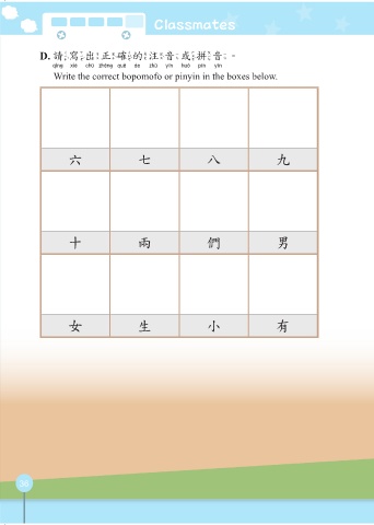 Classmates D. 請寫出正確的注音或拼音。 請寫出正確的注音或拼音 Write the correct bopomofo or pinyin in the boxes below. 六 七 八 九 十 兩 們 男 女 生 小 有 36
