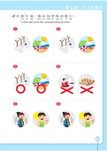 Let's Learn Mandarin (For Children) 第五課:冬天和夏天 C. 聽音檔,圈出相對應的圖片。 聽音檔 圈出相對應的圖片 Listen and circle the corresponding pictures. 1. 2. 3. 4. 5. 6. 51