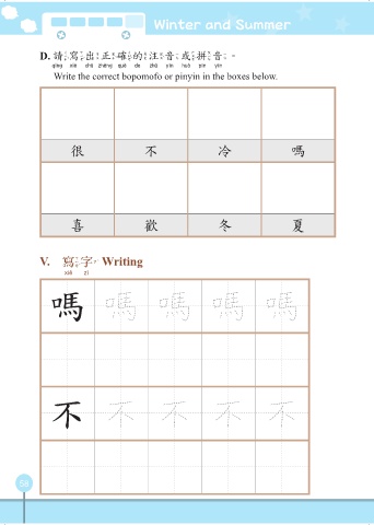 Winter and Summer D. 請寫出正確的注音或拼音。 請寫出正確的注音或拼音 Write the correct bopomofo or pinyin in the boxes below. 很 不 冷 嗎 喜 歡 冬 夏 V. 寫字 Writing 寫字 嗎 嗎 嗎 嗎 嗎 不 不 不 不 不 58