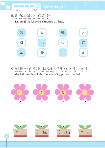 Birthdays B. 請念念看以下的字。 請念念看以下的字 Let’s read the following characters out loud. 的 日 號 月 我 六 生 你 三 幾 十 是 C. 請將以下的字連到相對應的注音、拼音。 請將以下的字連到相對應的注音 拼音 Match the words with their corresponding phonetic symbols. 生 日 號 十 日 rì 號 hào 生 shēng 十 shí 64