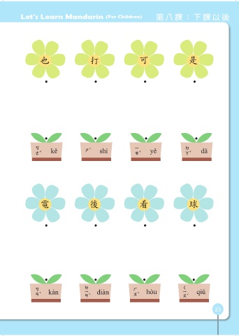 Let's Learn Mandarin (For Children) 第八課:下課以後 也 打 可 是 可 kě 是 shì 也 yě 打 dǎ 電 後 看 球 看 kàn 電 diàn 後 hòu 球 qiú 23